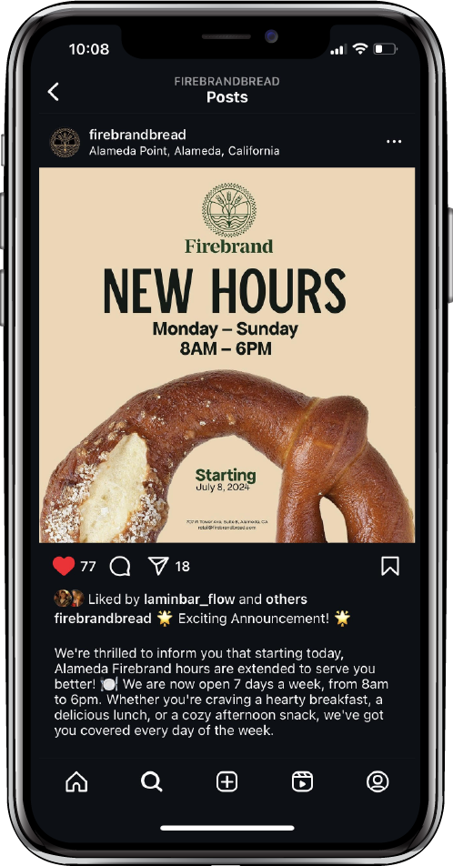 In July 2024, Firebrand Alameda decided to make the big move of being 5 days a week to 7 days a week. To spread the news, it must span through social media. I had the opportunity to create a post for their Instagram of their big announcement. I tried to make an eye-catching post, while staying in the Firebrand styleguide. To make the post eye-catching, I played with typography and photography of Firebrand’s famous pretzel knot. The idea is to be in your face letting the locals know about the big news.